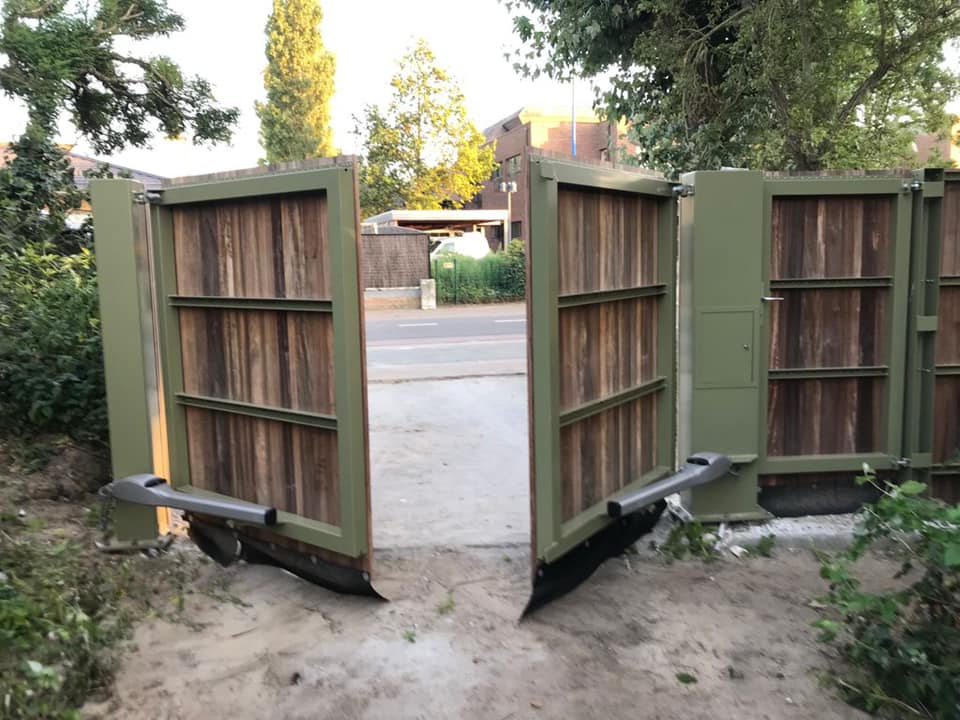 Volledig op maat vervaardigd ensemble van automatische dubbele draaipoort met bijpassende metalen brievenbus.