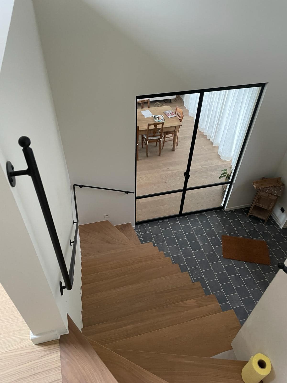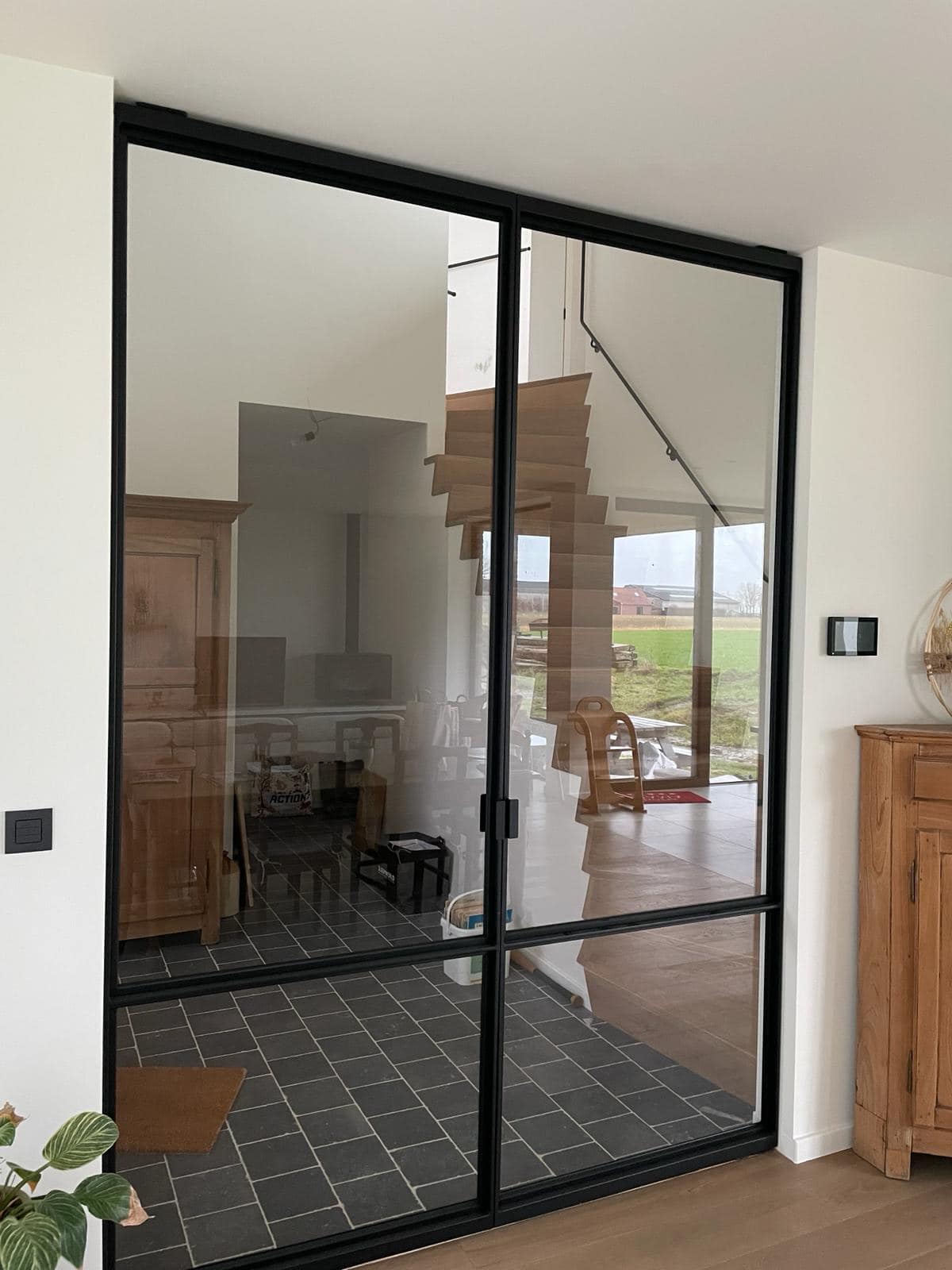 Een eyecatcher in het interieur: een dubbele pivoterende deur met slanke profielen in combinatie met een zwarte handgreep op de trap.