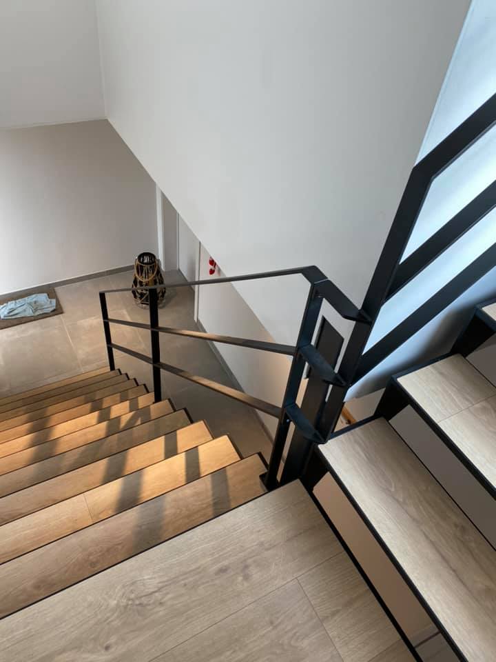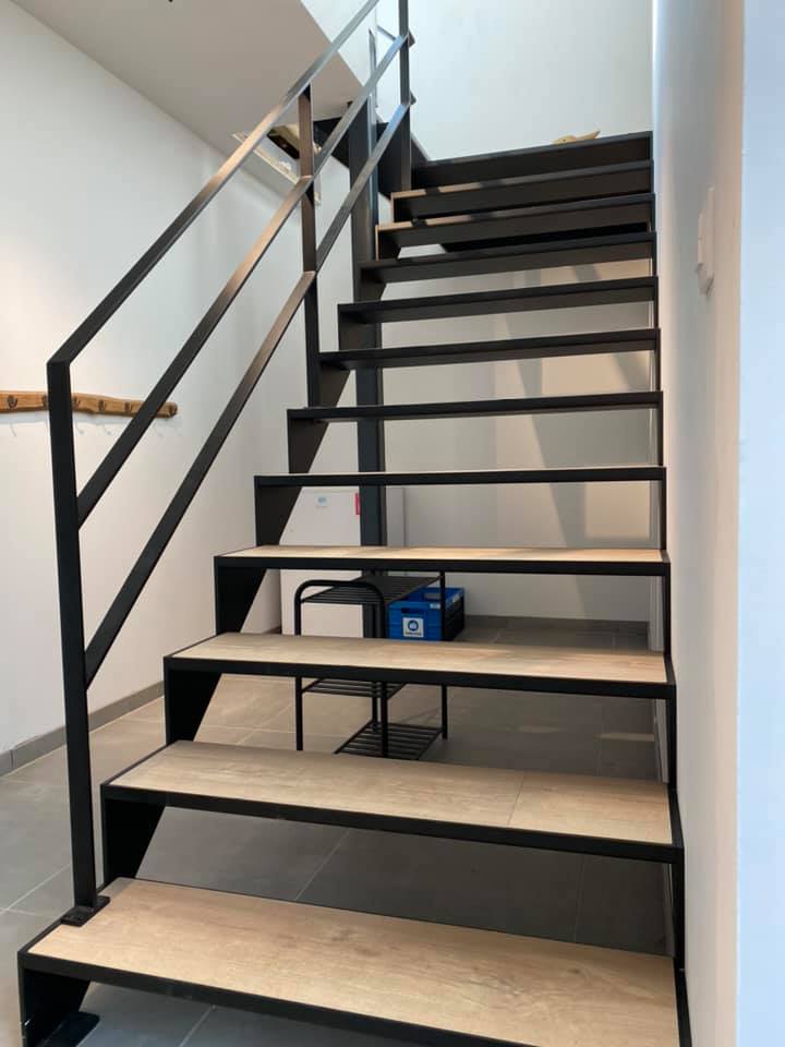 Zwart metalen trap met houten treden
