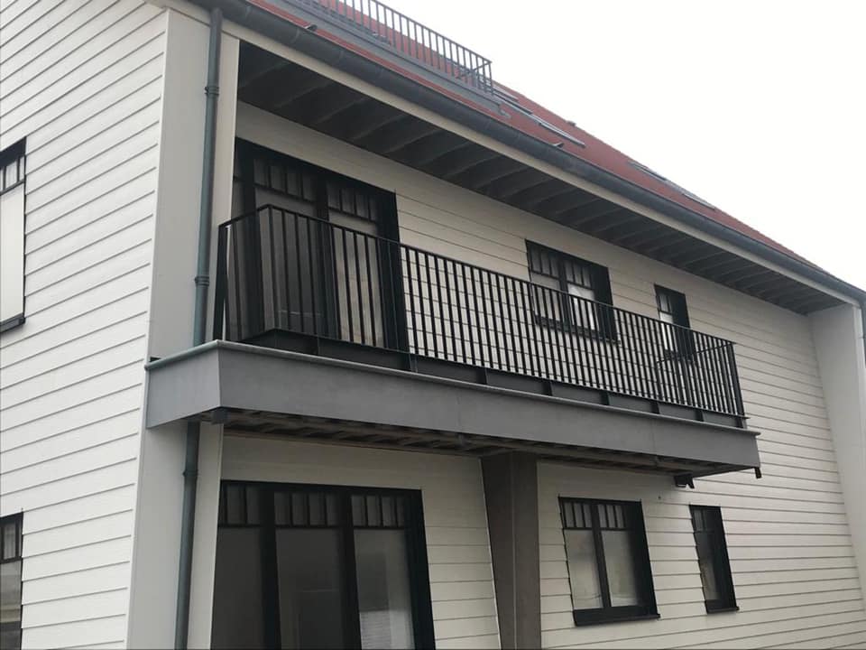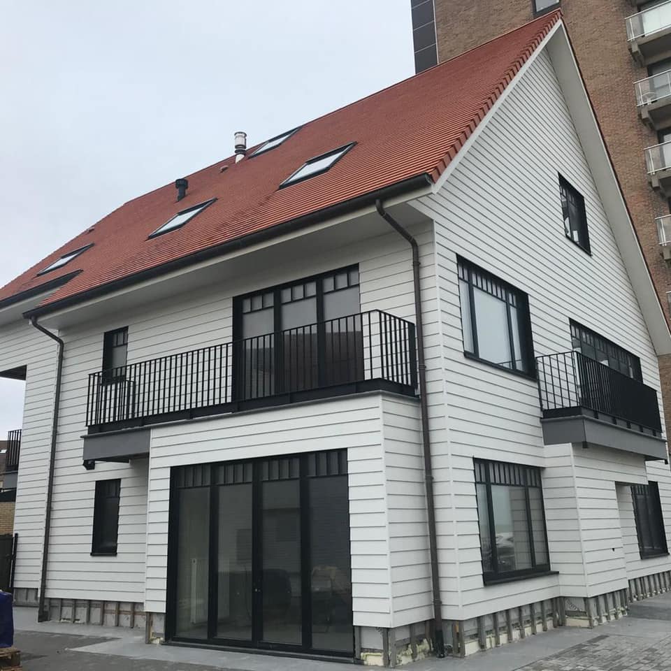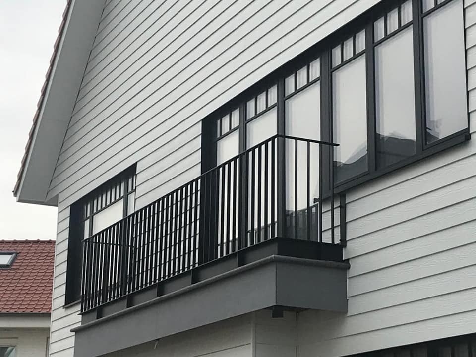 Mooie combinatie van een witte villa afgewerkt met zwarte metalen balustrades.