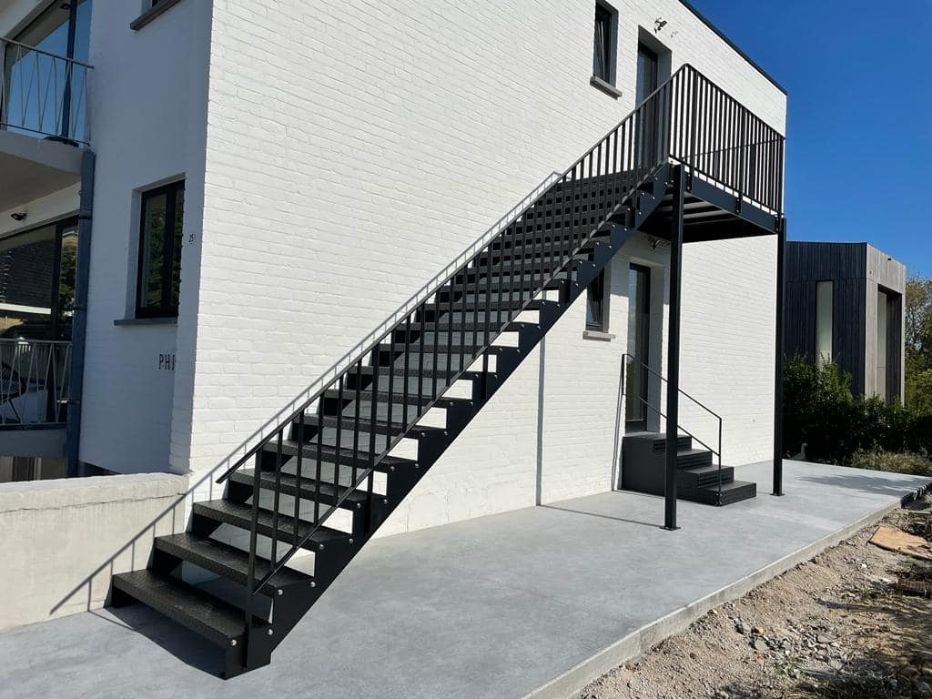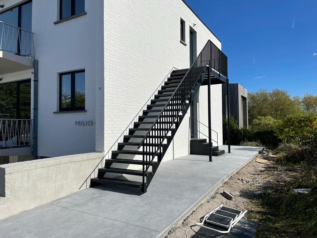 Een witte gevel met een zwarte metalen buitentrap zorgt voor een krachtig architecturaal contrast.